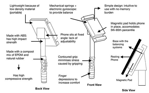I engineered a handheld phone stabilizer aimed at reducing the impact of hand tremors in individuals with Parkinson’s disease, applying inclusive design principles to prioritize comfort, usability, and accessibility. The device was developed to support daily smartphone use—such as reading, video calling, and taking photos—by mitigating unintentional hand movements through active control.