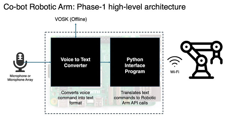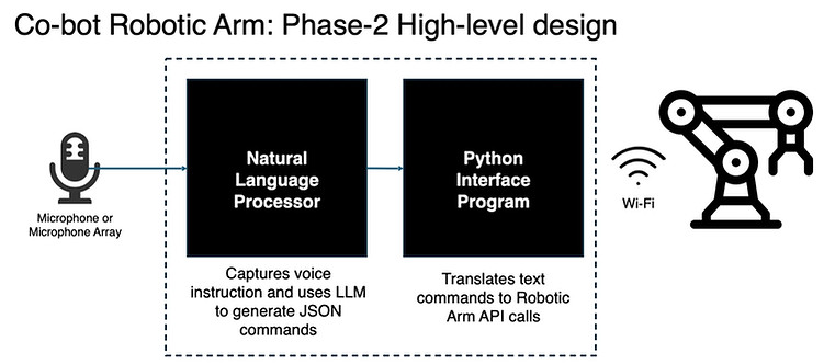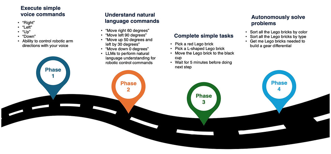 The current system combines Vosk for real-time speech recognition with the Mistral large language model to parse spoken commands (e.g., “move right 45° and up 60°”) and translate them into robotic actions. The prototype supports robust voice-to-action execution, and the next phase will focus on enabling high-level task understanding—allowing the robot to interpret open-ended instructions (e.g., “sort the LEGO bricks by color”) and autonomously plan and execute the appropriate sequence of actions.